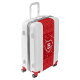 A stylish white suitcase adorned with a bold red heart design. The suitcase, featuring a prominent letter 'B', stands out against a backdrop of scattered heart-shaped confetti. Soft, diffused lighting enhances the cheerful mood, while a lively, composition captures the suitcase in a close-up, highlighting its unique design and inviting viewers to imagine their next adventure.