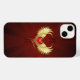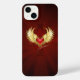 Bright red heart of an angel with golden wings shining in the dark radiant red background decorated with a pattern.