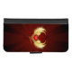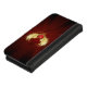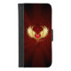 Bright red heart of an angel with golden wings shining in the dark radiant red background decorated with a pattern.