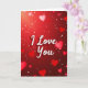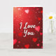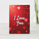 This card shows a deep red background that fades from a brighter red at the top to a darker red near the bottom. Across the front are many hearts in different sizes, with some sharp and easy to see and others softly blurred like they’re drifting past. Tiny white light specks are sprinkled around too, like little glimmers in the air. In the center, the words “I Love You” appear in white cursive-style lettering with a faint shadow that helps it stand out. The whole scene feels warm and close, like a quiet moment where you’re saying what matters most ❤️. It’s meaningful to give because it keeps the message simple and direct, while the hearts add a gentle sense of care and romance 🥰.