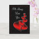Several red, frosted hearts of different sizes are stacked in layers on black background. Front says "I'll Always Love You". Both sides of inside have a personalized message. Every element of this template card can be customized with your own text. This card can be used for any romantic occasion including Valentine's Day, anniversaries, forever love, and others. You will find the design on many other products in my store.