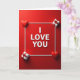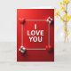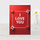 This Valentine's Day card features a deep red background with a white rectangular frame in the center. Inside the frame, the words “I LOVE YOU” appear in all caps, in white lettering, placed right in the middle so it’s the first thing you notice. In two opposite corners sit glossy red hearts that look slightly raised, with soft highlights that make them feel real. In the other two corners are small white gift boxes topped with neat red bows, adding a sweet, celebratory touch. The lighting is gentle and even, creating light shadows that give the hearts and boxes a bit of depth without looking busy. The simple layout makes the message feel direct and honest, like saying what matters most without extra fuss ❤️.