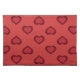 This cloth placemat features two-tone red and crimson hearts on a red background.