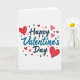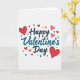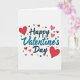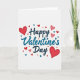 This design has a bright white background with the message “Happy Valentine’s Day” centered across three lines. The word “Happy” sits at the top in dark blue, written with thick brush-style strokes that draw the eye. Below it, “Valentine’s” appears in smooth teal lettering, adding a gentle flow to the design. The word “Day” finishes the message in the same dark blue as the top line. Surrounding the text are scattered hearts in red, pink, and teal. Larger red hearts sit near the upper left and lower right, while smaller hearts fill in around the words. The hearts have soft shading that makes them look slightly raised, as if floating. The mix of color and detail gives the card a sweet, cheerful feel, perfect for sharing love and kindness on Valentine’s Day 💕❤️