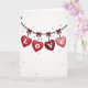 This sweet greeting card features four red and pink hearts hanging like a banner across the top of the design. Each heart holds a single white letter, together spelling “LOVE” in clear block lettering that’s easy to read. The hearts are suspended from a gently curved black string, with small red bows tied along the line as charming details. The background is white with light gray polka dots scattered throughout, giving the card a soft, cheerful look. The hearts have smooth outlines and slightly raised-looking letters that add depth and warmth. With its mix of bold reds, gentle pinks, and a timeless message, this card is a lovely choice for sharing affection with a partner, friend, or someone special on Valentine’s Day.❤️💌🍫.