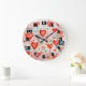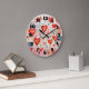 A clock with a fun mixed media style pattern. Big red hearts and various random shapes scattered around making a delightfully cute pattern.