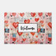 A welcome doormat with a fun mixed media style pattern. Big red hearts and various random shapes scattered around making a delightfully cute pattern.