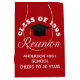 Custom class reunion party gift bags in red and white for a high school, college, or university. Customize with your school name and graduating class under the elegant calligraphy for great personalized alumni celebration gifts.