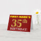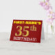 This birthday greeting card design features a message like "FIRST-NAME’S 35th BIRTHDAY!", with the "35th" having a faux/imitation gold-like color appearance. The recipient’s name on the front can be personalized, and the front background is colored red. It also features a personalized birthday greeting message on the inside. A birthday greeting card like this could perhaps be given to somebody in celebration of their thirty fifth birthday. [~Z0000184]
