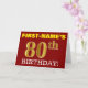 This birthday greeting card design features a message like "FIRST-NAME’S 80th BIRTHDAY!", with the "80th" having a faux/imitation gold-like color appearance. The recipient’s name on the front can be customized, and the front background is colored red. It also features a personalized birthday greeting message on the inside. A birthday greeting card like this could perhaps be given to somebody in celebration of their eightieth birthday. [~Z0000184]
