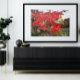 Add a splash of color to your walls with this glossy style poster print featuring a colorful, photographic image of bright, red Japanese maple leaves and a miniature, red Shinto shrine in a Japanese garden. Customize your poster print size as desired. Frame not included. Photo: Point Defiance Park Japanese Garden