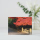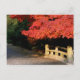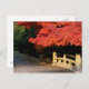 The flaming red leaves of a large Japanese maple standing beside a small bridge.