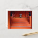 Postcard featuring photography of a red shrine with two tiny turquoise colored vases.