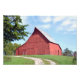 A red barn, blue sky and green grass create a beautiful pastoral scene on a farm in Kansas. The branches of a red cedar hang in the foreground.