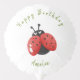 Birthday balloon featuring a watercolor illustration of a sweet ladybird. The top displays green 'Happy Birthday,' and the bottom is customizable with a name. You can personalize all the text. On the other side, a red heart with black dots.