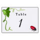 Art features a watercolor of a green vine with a leaf. There is a picture of a red ladybug by the table number. Words note "Table 1" but can be personalized with your own words and messages. Create your own unique one-of-a-kind table card design by customizing these template lady bug garden insects table cards for your wedding, reception, or other personal event information.