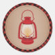 A sticker featuring an illustration of a red camping lantern over a card stock inspired background with a red and black plaid border. Look for matching invitations at Jill's Paperie.