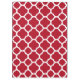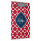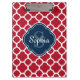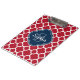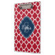 Navy blue and white quatrefoil label frame featuring a customizable name and monogram template. The background is a red and white Moroccan trellis lattice pattern.