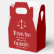 This modern custom law school graduation party favor box features the college graduate name in elegant white script on red for the class of 2026. Customize with your university under the scales of justice with a graduation thank you message for a new lawyer.