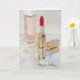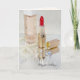 Bright red tube of lipstick on mirror with diamond and pearl jewelry for birthday.