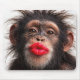 A chimpanzee playfully wears red lipstick, with its expressive eyes and wild hair enhancing the humorous effect