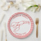 NewParkLane - Personalized Lobster Boil Summer Party Plates, with a cute hand drawn red lobster line illustration, against a red striped background. A fun theme for a summer (seaside) party or your 4th of july celebration with friends and family!