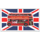 This British-themed large tablecloth features a retro red London bus set on the Union Flag and contains text that can be personalized with any name or expression, for any special occasion. Red, white, blue, yellow and black colors.