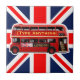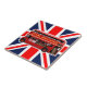 This custom ceramic tile features the famous red double-decker bus, a very popular symbol of London and Britain, set on top of the Union Jack.