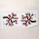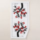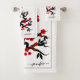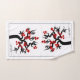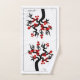 Red love birds sakura cherry tree with blossoms and black border bath towel set. It features a black sakura tree with red flowers with black hearts in the center and a pair of love birds. Your name is written in a script style font.