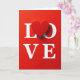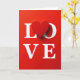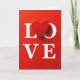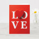 This card shows the word “LOVE” set on a deep red background, with the “O” replaced by a raised red heart in the center. The letters L, V, and E are in all caps and bright white, standing out clearly against the red. The heart looks smooth and slightly three-dimensional, like it’s sitting on top of the surface. Soft lighting creates gentle shadows under each letter and under the heart, giving the design a little depth. The text sits across the middle of the card, with the heart drawing your eye first. Overall, it feels simple, romantic, and easy to understand at a glance, making it great for a partner or a close friend