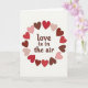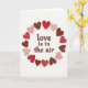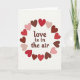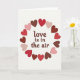 This Valentine's Day card features the phrase “love is in the air” in dark chocolate-brown letters placed right in the center. The letters have a rounded serif look, and the words feel warm and easy to read. Around the text, a wreath of hearts forms a loose circle, with each heart tilted a bit as if it’s gently floating. The hearts come in bright red, soft pink, and terracotta brown, and they sit on a plain white background that keeps everything clear. A light shadow and slight pressed-in look on the hearts and text add a bit of depth without making the design feel busy. Overall, it gives a calm, sweet feeling that fits romance or close friendship ❤️💕. Share it with someone special and let them know you’re thinking of them this Valentine’s Day.