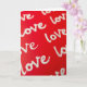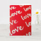 The front design shows a deep crimson background that feels like a warm wash of color, setting a romantic tone ❤️. Across the entire surface, the word “love” repeats in white lettering, scattered like a pattern that fills the scene from edge to edge. Each “love” looks slightly different, with small changes in stroke thickness that make it feel like it was written by a real person in a tender rush 🥰. The white text sits on top of the red field with strong contrast, so the words stand out clearly even where they overlap the texture of the paper. There aren’t any characters or a specific place shown, but the close-up view makes it feel like you’re leaning in close to something meant for someone special. The repeated word forms a cozy backdrop, like gift wrap or a note left on a table, where affection is shown through repetition rather than a single grand statement. The text is spread evenly across the card face with no empty border, and the white paint-like marks show tiny imperfections and soft edges against the rich red.