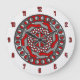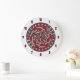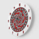 This concentric circle design contains layers of geometric patterns that resemble gears that you might find in modern or even alien machinery, in shades of red and gray.