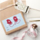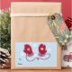 A cute pair of red holiday mittens with a red string and a snowflake design. A background of blue with white snowflakes.