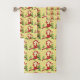 These cute bath towels feature a repeating pattern of a red monkey with a long curling tail on a tree branch surrounded by green leaves.