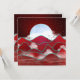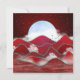 Abstract landscape design in various shades of red with a moonrise, hills, trees, clouds, and birds.