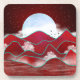Abstract landscape design in various shades of red with a moonrise, hills, trees, clouds, and birds.