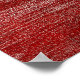 Abstract landscape design in various shades of red with a moonrise, hills, trees, clouds, and birds.