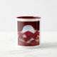 Abstract landscape design in various shades of red with a moonrise, hills, trees, clouds, and birds.