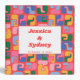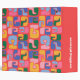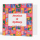 This wedding planner binder features an all-over bold retro squiggle pattern in pink, blue, green, yellow, and orange on a bright red background, with a white label on the front printed with the couple's names and wedding date in chunky red lettering. "Wedding planner" runs down the spine in white script so it's easy to find on a shelf.