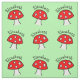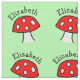 Whimsical red cartoon mushrooms with a name above the cap. The background is pale mint green.