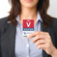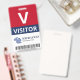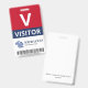 Vertical visitor badge with a large V against a white background. Visitor beneath in clean letters. Add your logo and bar code. Visitor badge personalized with logo and barcode in a minimalist design in red, white, and navy blue.