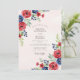 This vibrant design features lush red roses and navy blue anemones rendered in a painterly watercolor style. Sprigs of soft green foliage and delicate berries complement the bold floral palette. The pale pink backdrop provides a subtle, romantic base for the striking botanical elements, making it ideal for a summer or patriotic theme.