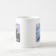 A personalized mug with a photo of a pretty red northern cardinal standing on a wooden tree stump. Blue and white blurred background.