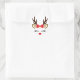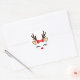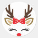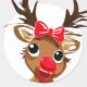 A whimsical illustration of a reindeer face, featuring large, expressive closed eyes adorned with long eyelashes. The reindeer has a bright red nose and a cheerful red bow on its head, contrasting with the soft brown antlers.