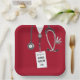 Creative nursing school graduation party plates design featuring red hospital scrubs. Edit text to add nurse's name.