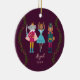 Fun and whimsical Christmas ornament featuring hand drawn illustration of cat, dog, and mouse as nutcracker ballet characters. The background is red.