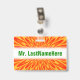 This vibrant, energetic and eyecatching badge design features a bursting explosion-like pattern featuring colors like red, orange and yellow. It also features a customized name in green colored text within a white colored area. A badge like this could perhaps be worn by a teacher, educator, tutor or professor during the early weeks of a school year or a course. It might help the students learn and remember their teacher’s name. [~Z0000175]