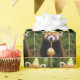 A red panda wearing a party hat gazes endearingly at the viewer while holding a cupcake with a lit candle