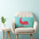 A red, quatrefoil patterned silhouette of a rooster is on a turquoise colored background with a wood grain texture. The back of the pillow is just the red quatrefoil pattern.